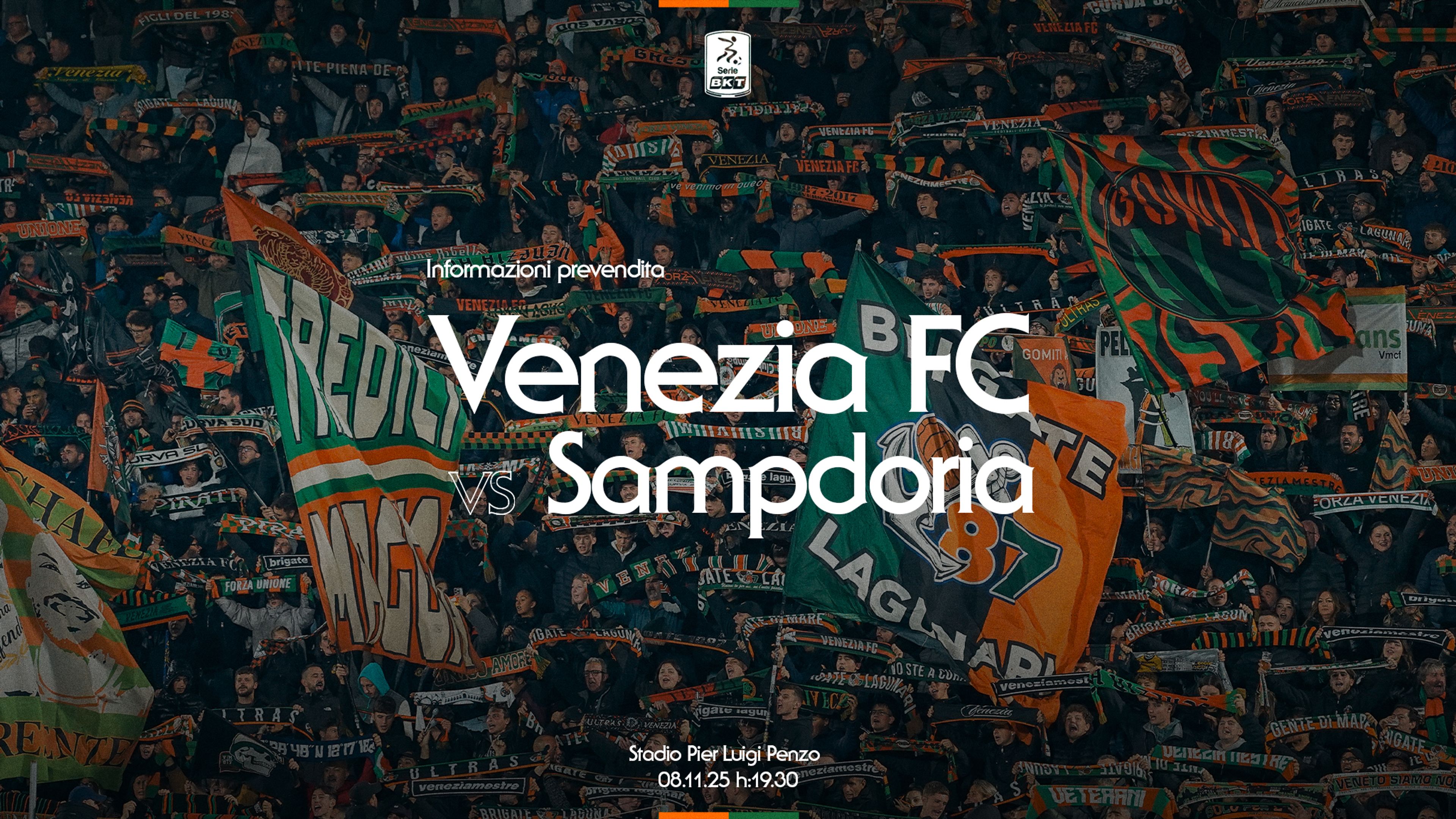 A partire dalle ore 15:00 di lunedì 3 novembre sarà attiva la prevendita dei biglietti per la gara Venezia FC – UC Sampdoria, valida per la 12ª giornata del Campionato di Serie B 2025/2026, in programma sabato 8 novembre alle ore 19:30 allo Stadio Pier Luigi Penzo.